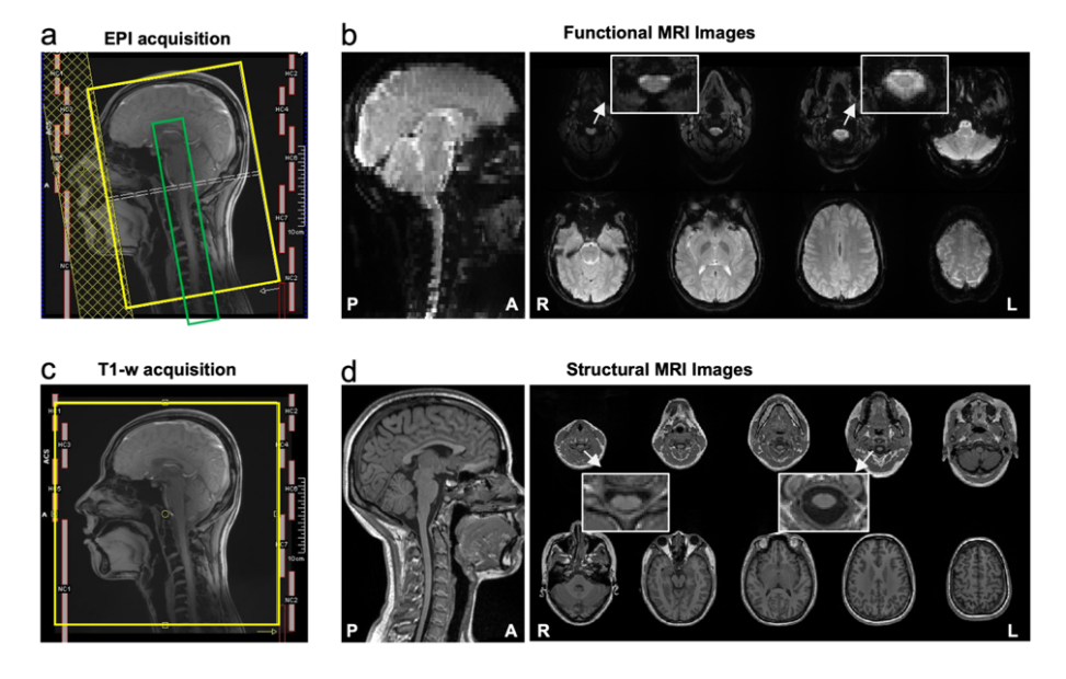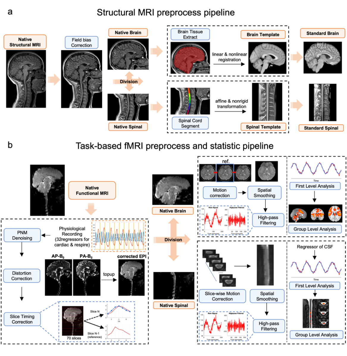 在成像方法之外,研究团队还构建了基于本成像方案的数据预处理与统计分析框架,实现了从数据采集、预处理到标准化配准的系统化优化流程(见图2)。该流程整合了FSL(FMRIB Software Library)与Spinal Cord Toolbox (SCT) 等国际主流软件包,并针对脊髓解剖结构的特殊性进行了多项算法优化。结合呼吸与心跳信号的实时记录,利用生理噪声建模方法实现多层去噪,显著提升了信号的稳定性。同时,针对脑干和脊髓易受磁场不均影响的问题,方案引入局部匀场优化与反向相位B₀校正策略,有效减少了几何形变和信号丢失。经预处理后的图像信噪比显著提升。