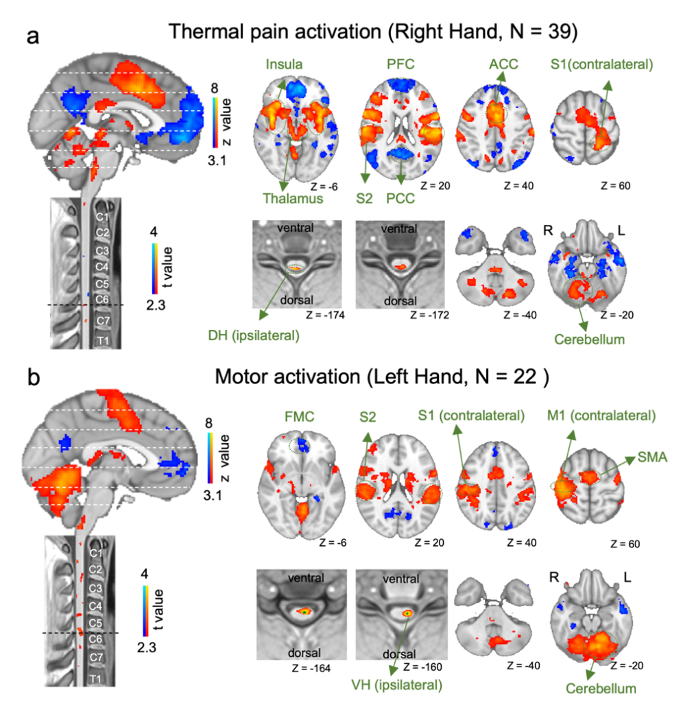 图3. 经典接触性热痛和主动运动任务诱发脑-脊髓激活